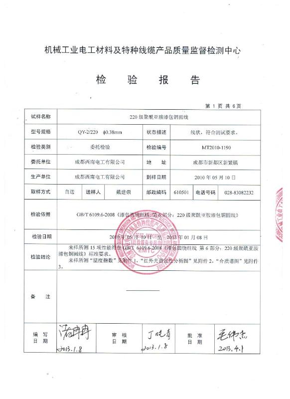 我公司220级聚酰亚胺、240级芳族聚酰亚胺漆包铜圆线于2014年12月通过上缆所型式试验,这代表着西南电工在聚酰亚胺漆包线领域取得了长足的进步。220级聚酰亚胺、240级芳族聚酰亚胺漆包线的产品特性为耐超高温、超低温、抗辐射、超负荷能力强,绝缘性能优异,使用领域将全面覆盖航空航天、国防军工、核能等多种特殊领域。